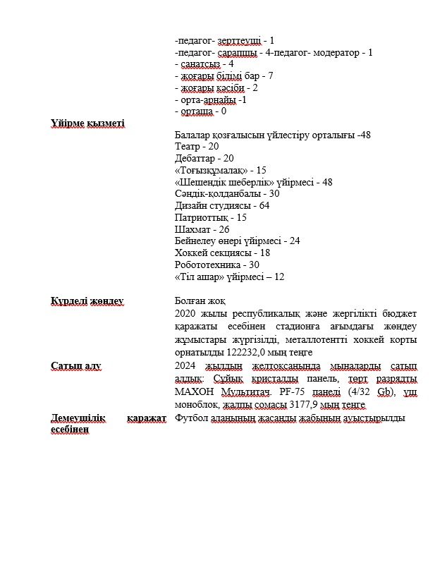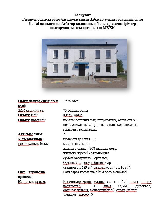 "АҚМОЛА ОБЛЫСЫ БІЛІМ БАСҚАРМАСЫНЫҢАТБАСАР АУДАНЫ БОЙЫНША БІЛІМ БӨЛІМІНІҢ ЖАНЫНДАҒЫ АТБАСАР ҚАЛАСЫНЫҢ БАЛАЛАР - ЖАСӨСПІРІМДЕР ШЫҒАРМАШЫЛЫҚ ОРТАЛЫҒЫ" МЕМЛЕКЕТТІК КОММУНАЛДЫҚ ҚАЗЫНАЛЫҚ КӘСІПОРНЫ