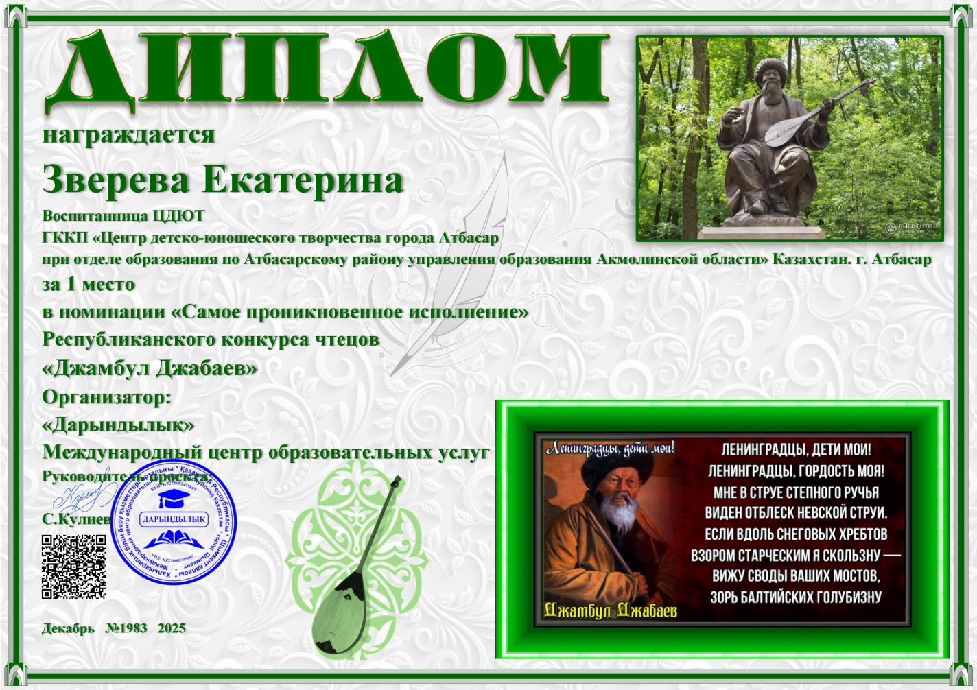 «Жамбыл Жабаев» республикалық оқырмандар байқауында «Ең шынайы орындау» номинациясы.